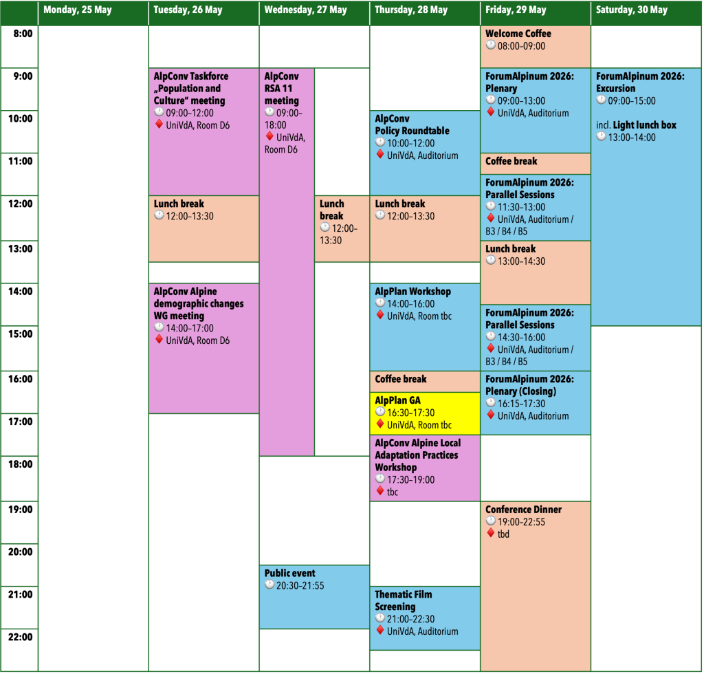 | Afternoon | Summer School Day 1 | Summer School Day 2 | Summer School Day 3 | Summer School Day 4 | Forum Alpinum 2026 | Excursion |
